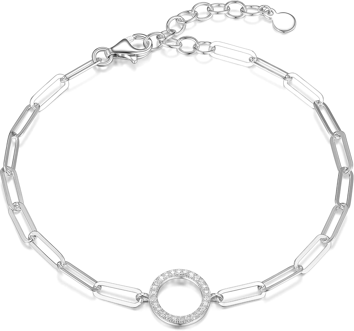 Amazon Collection Cubic Zirconia Geometric Circle Paperclip Chain Link Bracelet in Sterling Silver, 6.75" + 1.5" Extender