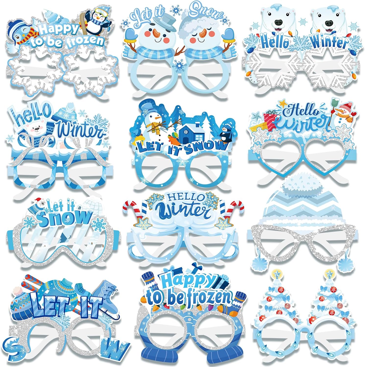 HOWAF Winter Party Favors Paper Glasses,24 pcs Winter Wonderland Snow Frozen Booth Eyeglasses Props,Blue and Silver Snowflake Selfie Props for Xmas Winter Party Supplies