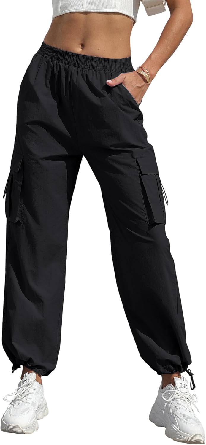 Women's High Waisted Cargo Pants Baggy Trendy Hiking Parachute Pants with Pockets Y2K Cargo Trousers Drawstring Ankles Black