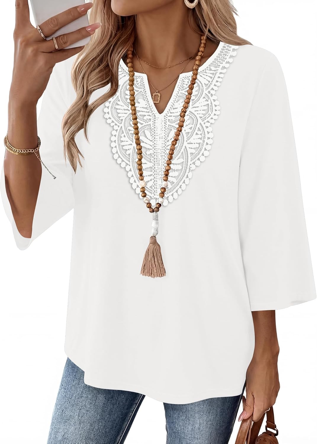 Ivicoer 3/4 Length Sleeve Womens Tops Boho V Neck Lace Shirt Vacation Clothes Trendy Blouses Dressy Casual