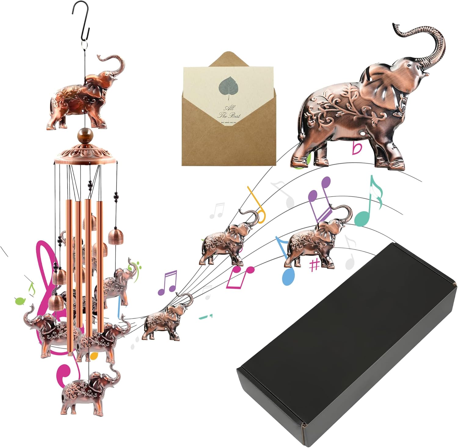 - Unique wind chimes:The Elephant wind chime is handmade by designers. And wind chime consists of a Larger Elephant, 6 small Elephant, 4 aluminum tubes, 1 S-shaped hook, 6 bells and 10 finials combines to form an elegant wind chime. The unique creative design and beautiful vintage give it an artistic flair that can become the focal point of your indoor and outdoor decor.