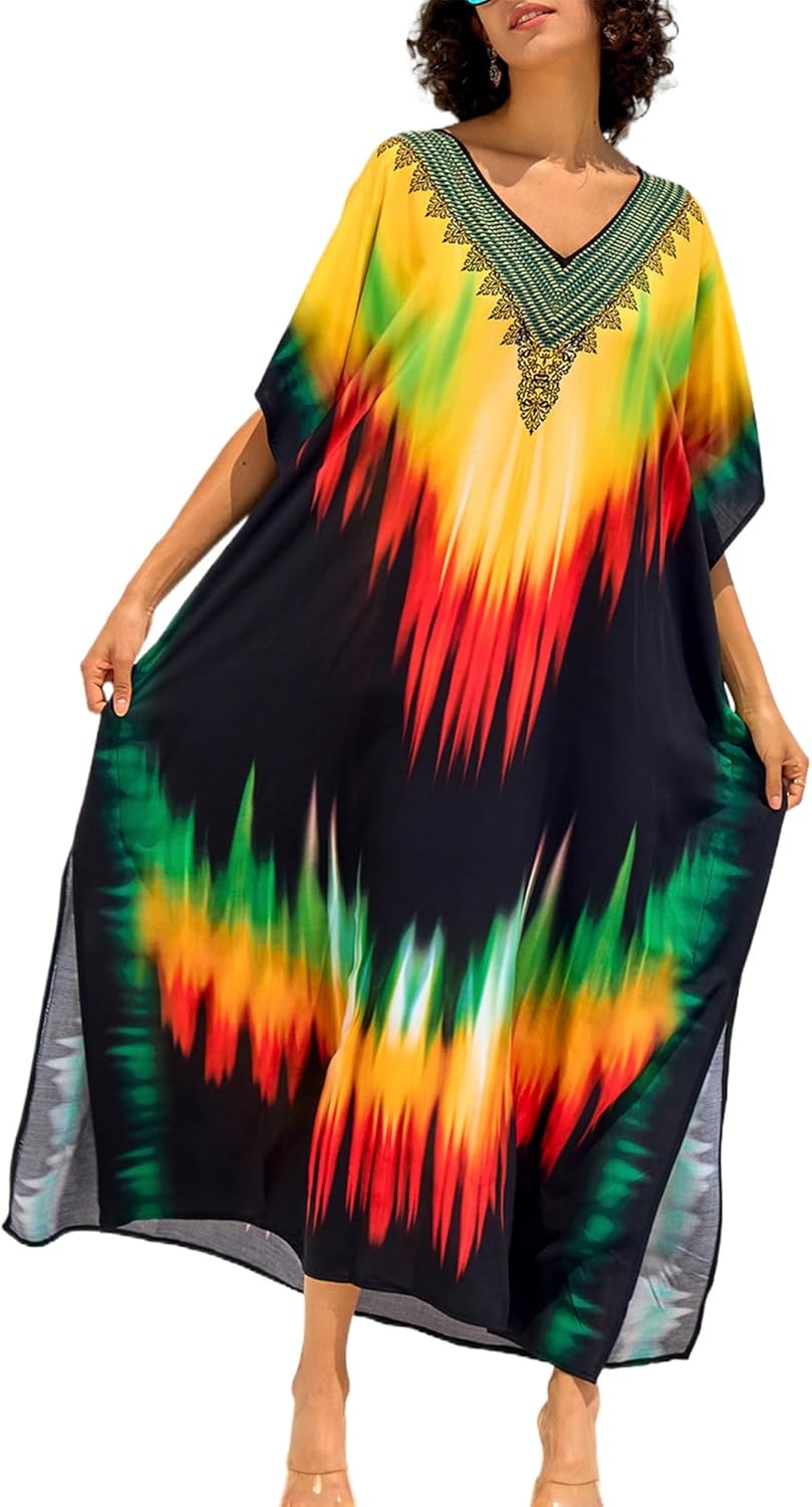 Chunoy Women Tie Dye Kaftan V Neck Casual Kimono Sleeve Bathing Suit Side Split Beach Cover Up Caftan Dress