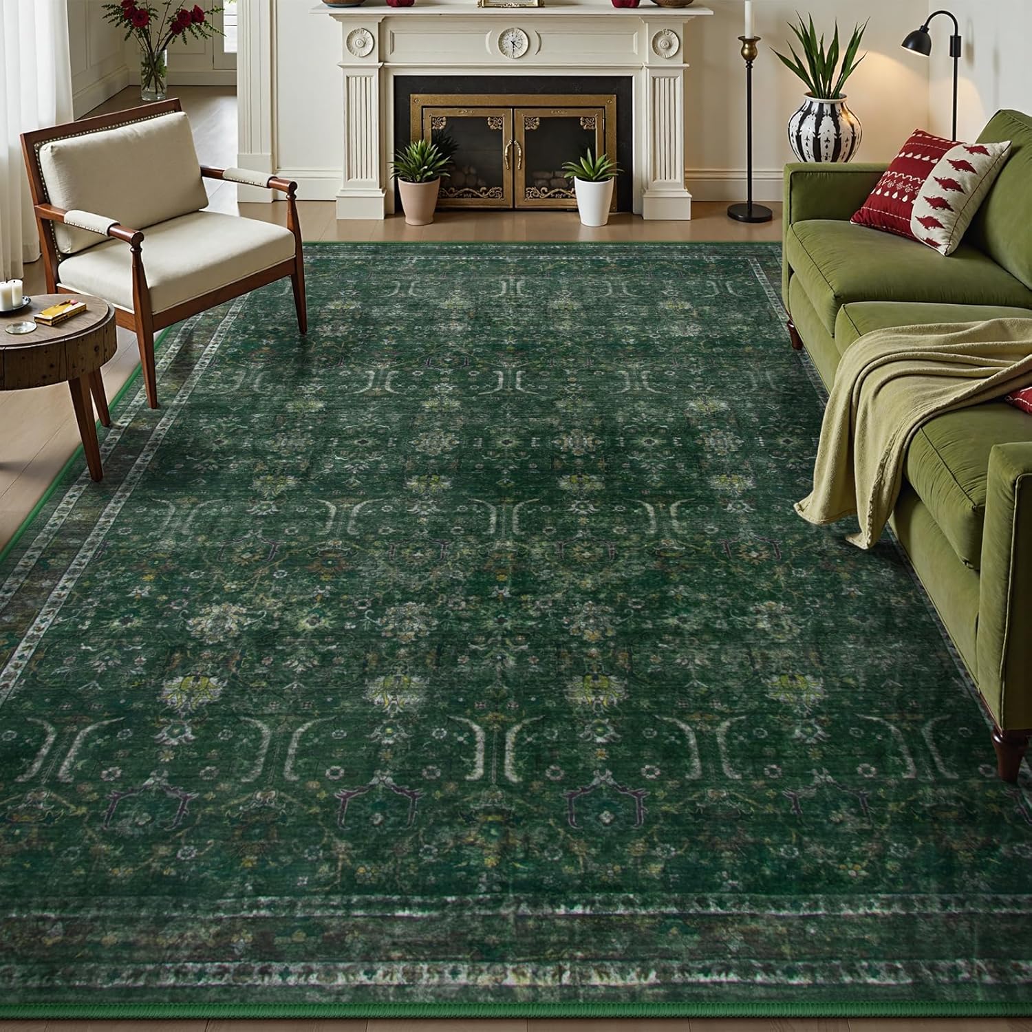 Moynesa Green 8x10 Living Room Rug, Vintage Washable Area Rug for Bedroom Dining Room Office, Low Pile Soft Non-Slip Retro Accent Carpets for Kitchen Indoor Nursery