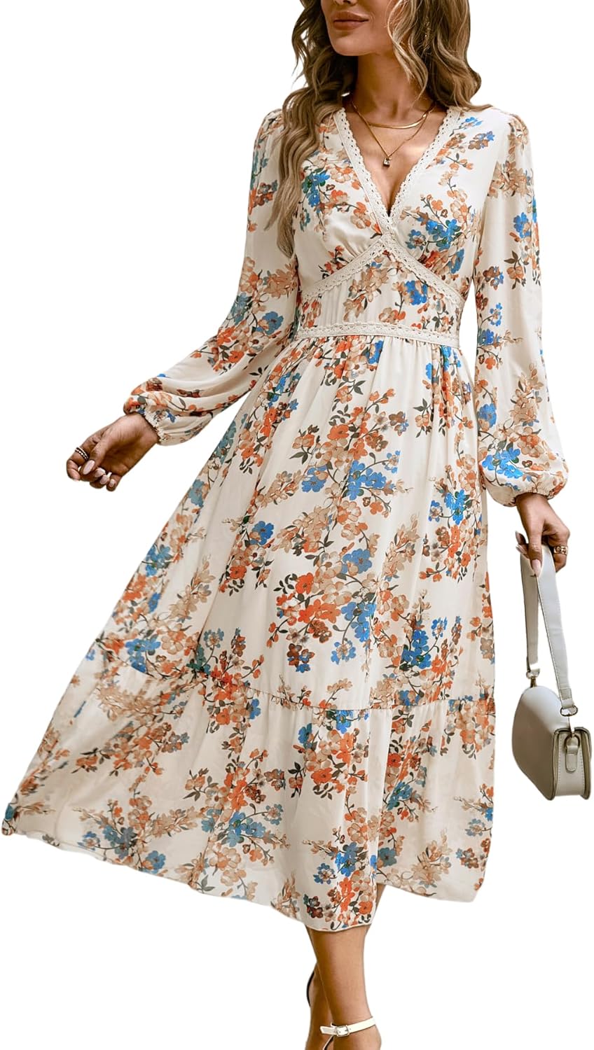 Women's Spring Wrap Maxi Dress Floral V Neck Long Sleeve Wedding Guest Party Casual Chiffon Dress
