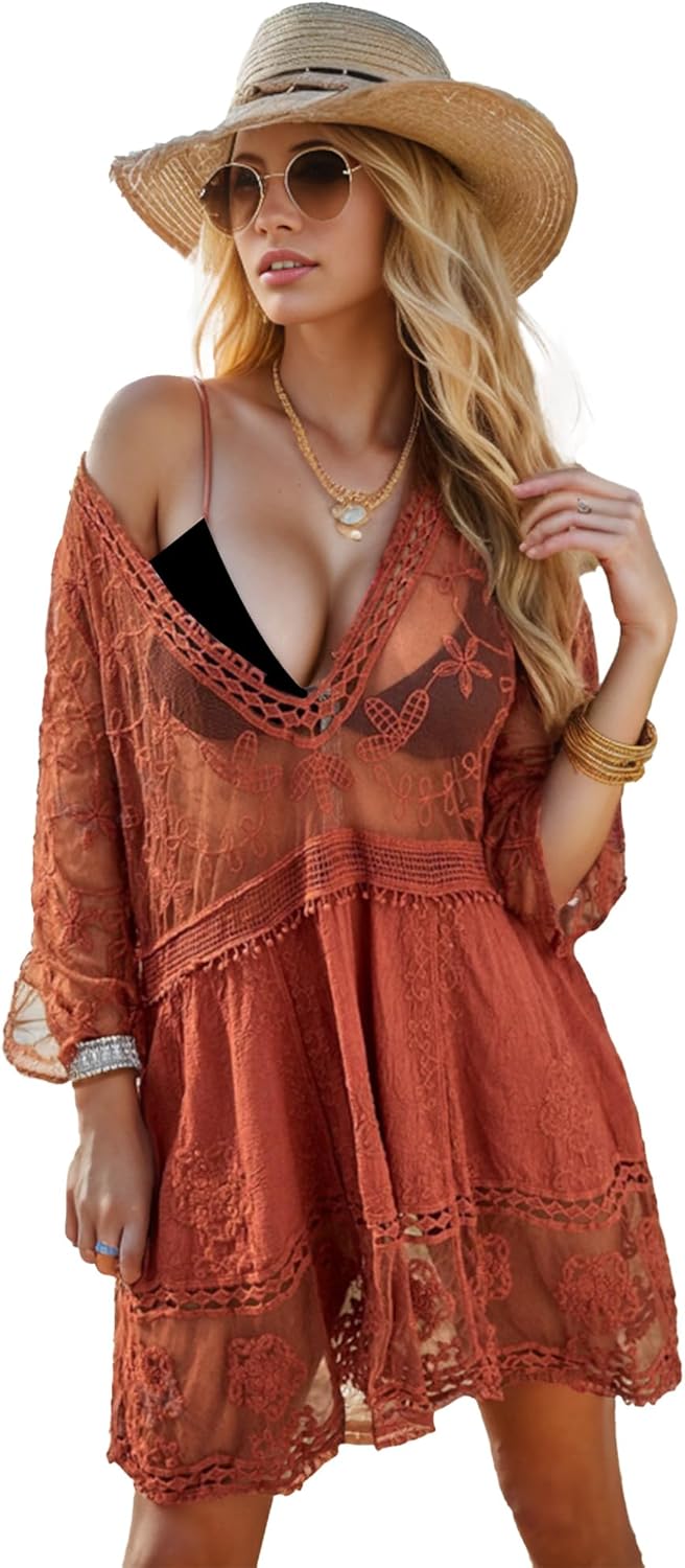 Moss Rose Women's Lace Bathing Suit Cover Up V-Neck Coverups Swimwear Swimsuit Swim Beach Dress Beachwear