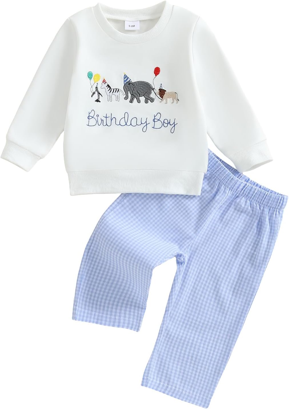 Toddler Baby Boy Birthday Clothes Zoo Animal Birthday Boy Crewneck Sweatshirt and Plaid Pants Set 2Pcs Fall Outfit