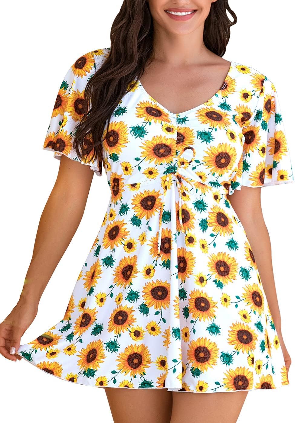 ECUPPER Womens One Piece Swimsuit with Sleeves Plus Size Swim Dress Modest Tummy Control Skirt Bathing Suit Built in Shorts