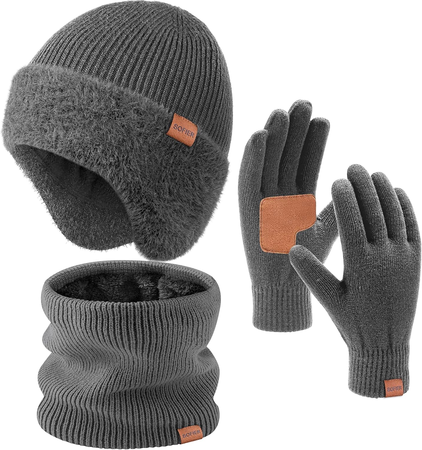 Sofier Winter Hat Fleece Lined Beanie with Earflap Neck Warmer Scarf Touchscreen Gloves Warm Knit Set for Men Women
