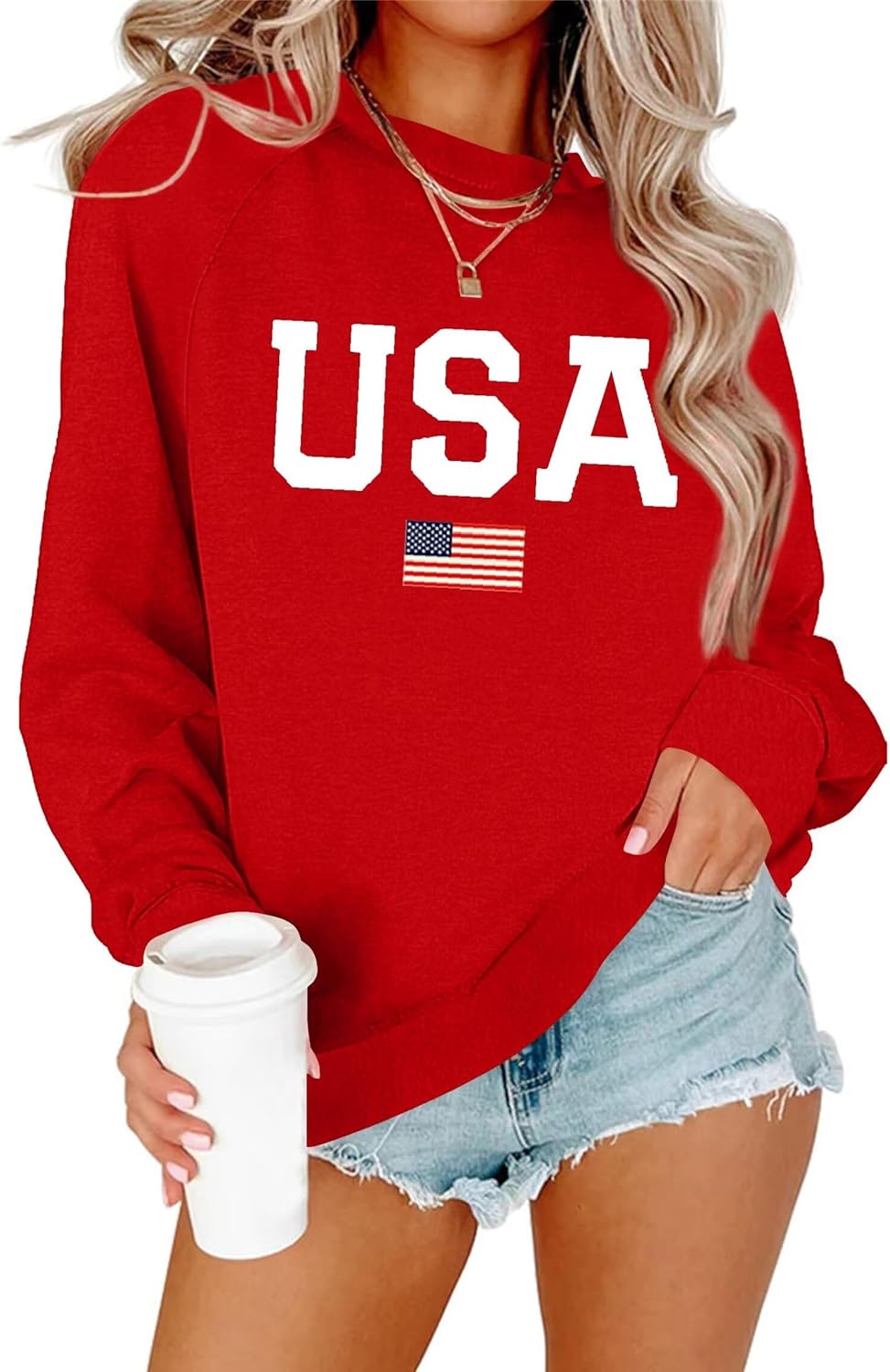 Dressmine Womens USA Shirt Casual Long Sleeve Graphic Tees Knit Crew Neck Sweatshirts Loose Pullover