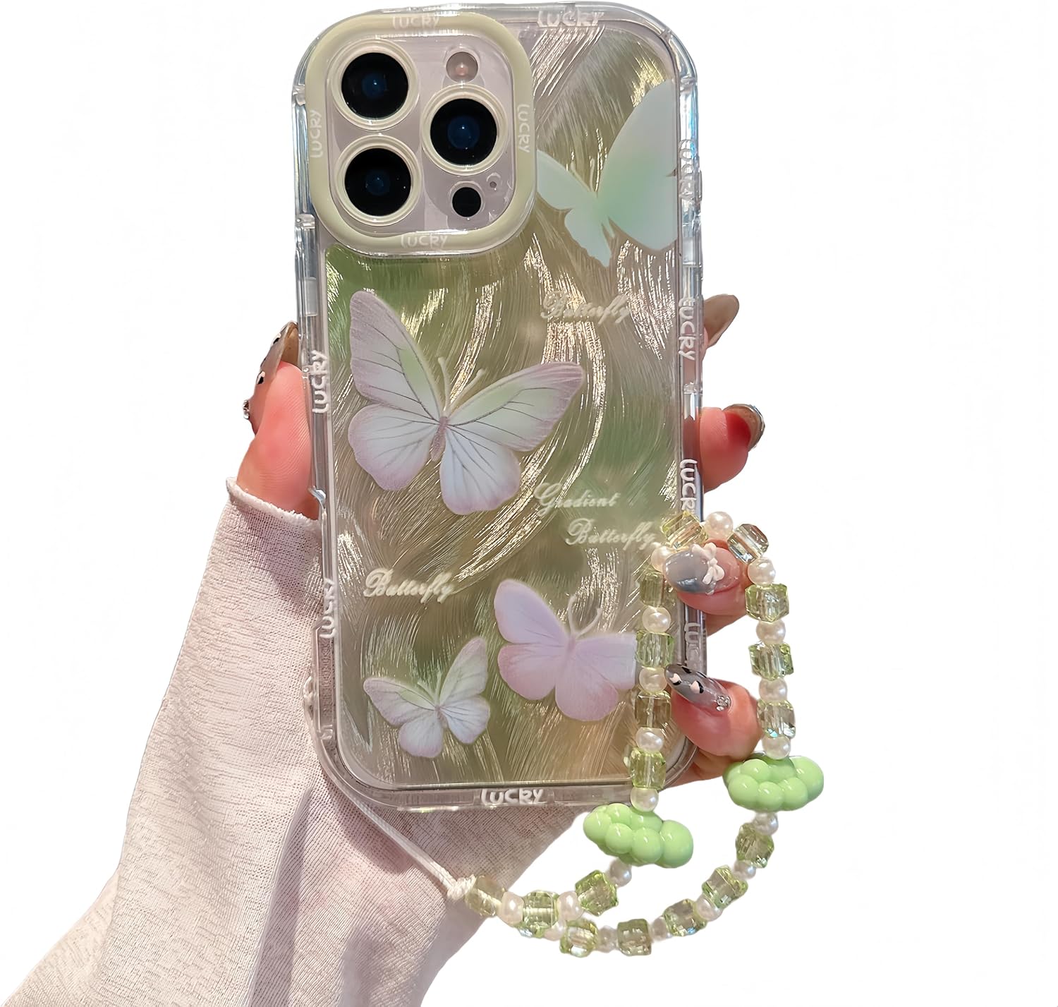 for iPhone 16 Pro Max Case, Light Green Butterfly Pattern Design,Sparkling Laser Case,2-in-1 with Beaded Wrist Strap,Soft TPU Frame, Shockproof and Anti-Shock, Suitable for Women & Girls