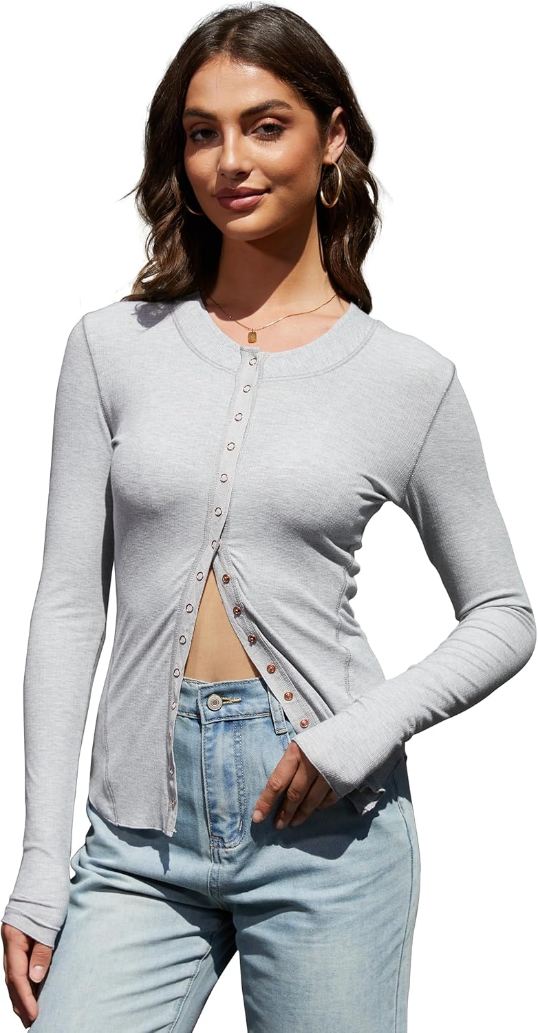 Cardigan For Women Lightweight Snap Button Down Shirts Ribbed Knit Long Sleeve Tops Crewneck Slim Fit Y2K Going Out Tops