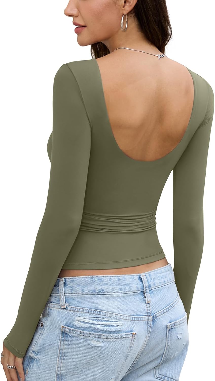 Womens Backless Double Lined Top Long Sleeve Y2K Going Out Top Sexy Open Back Boat Neck Shirt Slim Fit Spring Fall Tee