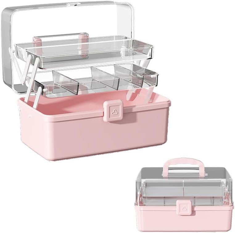 12.9in Three-Layer Multipurpose Storage Box with Handle Portable Tackle Box Folding Art & Craft Case Sewing Supplies Organizer for Makeup, Medicine, Nail, Hair Accessories (Pink)