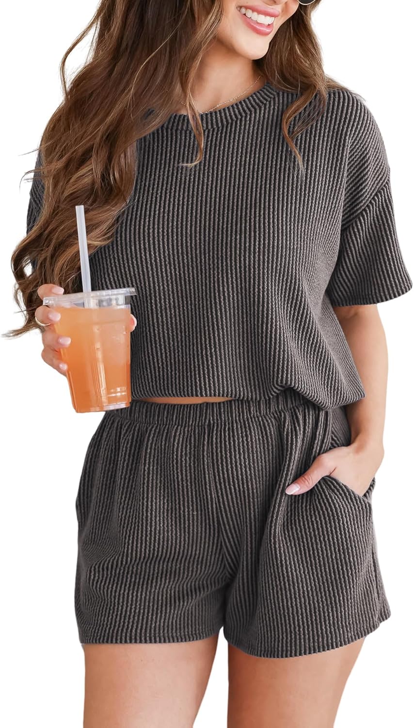 Women's 2 Piece Outfits Summer Knit Short Sleeve Top and Shorts Set Soft Casual Lounge Sets