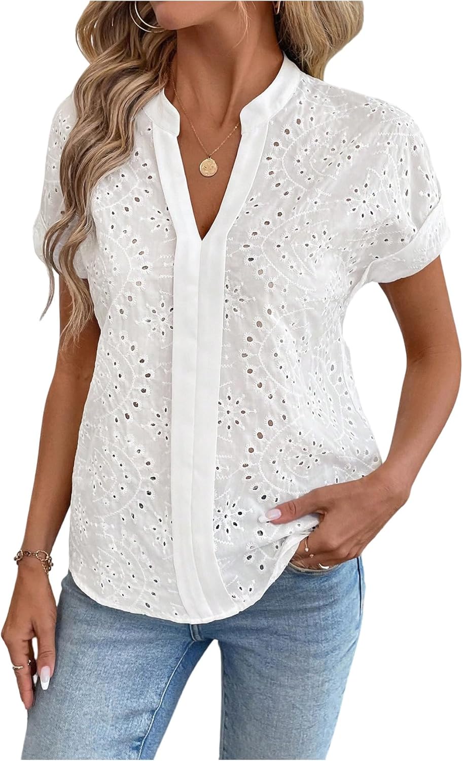 SweatyRocks Women's Boho Summer Blouses Eyelet Embroidery Dolman Short Sleeve V Neck Tops
