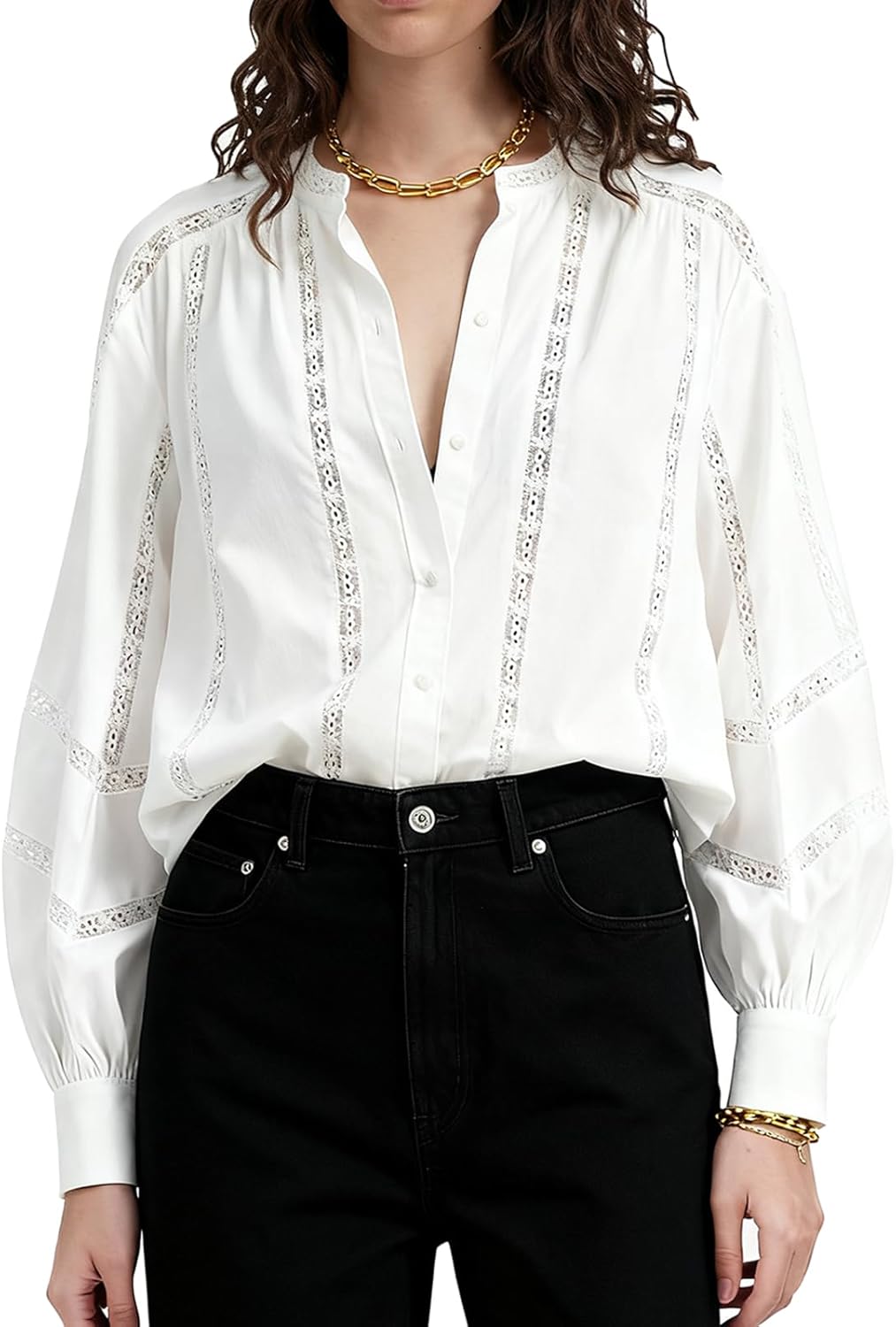 Womens Y2k Lace Patchwork Button Down Shirts Crew Neck Long Sleeve Fall Loose Top Solid Work Office Blouse