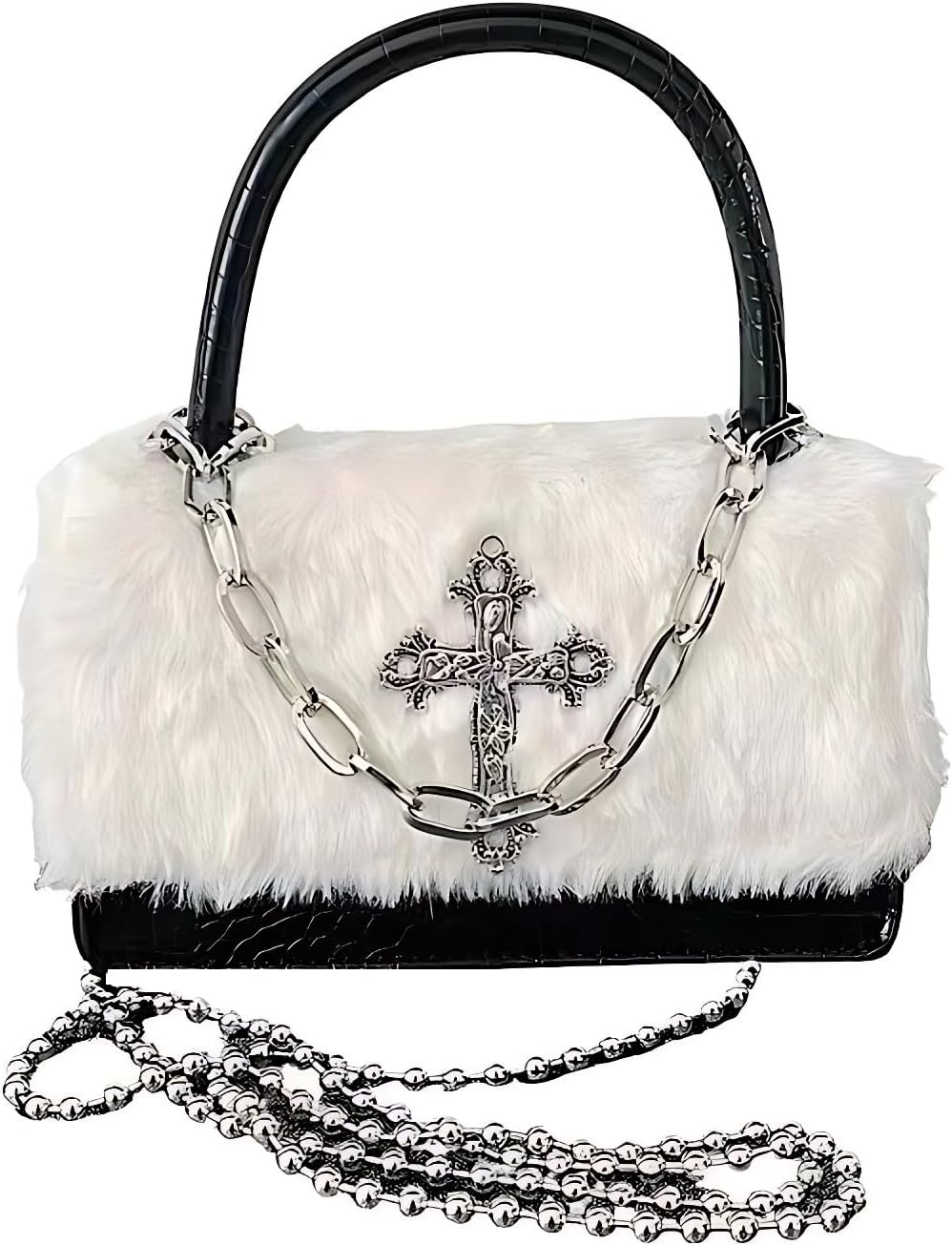 Y2K Gothic Punk Handbag Indie Cross Studded Shoulder bag for Egirl Woman Kawaii Purse Cool Girl Crossbody Fluffy Bag