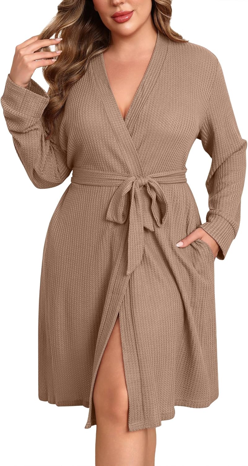 Ekouaer Women's Plus Size Robe Waffle Knit Bathrobe Short Lightweight Kimono Robes with Pockets Ladies Loungewear 1x-5x