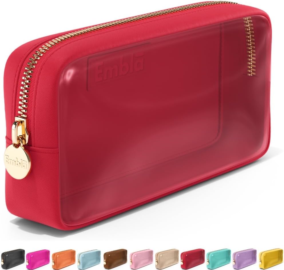 Embla Clear Cosmetic Bag Makeup Case, Clear Zipper Make Up Pouch and Toiletry Travel Tote, Cute Skincare Pouches for Women Girls, Preppy Purse Cosmetic Organizer, Small Makeup Bags, Ruby Red