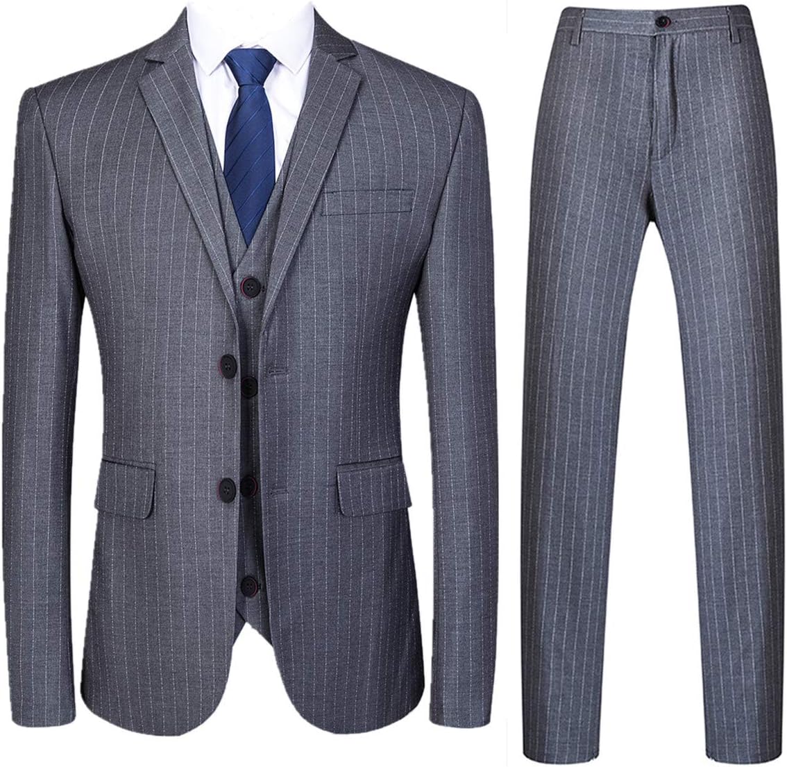 Mens 3 Piece Pinstripe Suit Slim Fit Casual Dress Suits Blazer + Vest + Pants