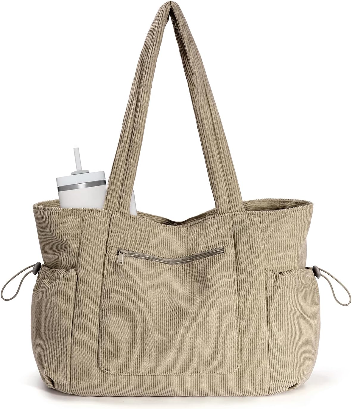 ECOHUB Large Corduroy Tote Bag for Women with Cup Holder & Luggage Sleeve & Laptop Compartment for Work Travel College Casual