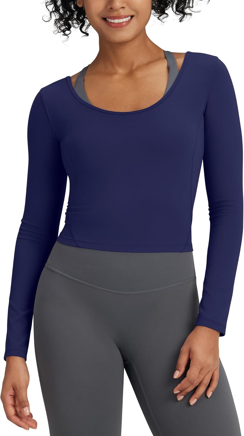 G4Free Barefeel Slim Fitted Womens Long Sleeve Crop Workout Tops Low Back Athletic Yoga Exercise Shirts Scoop Neck Base Layer