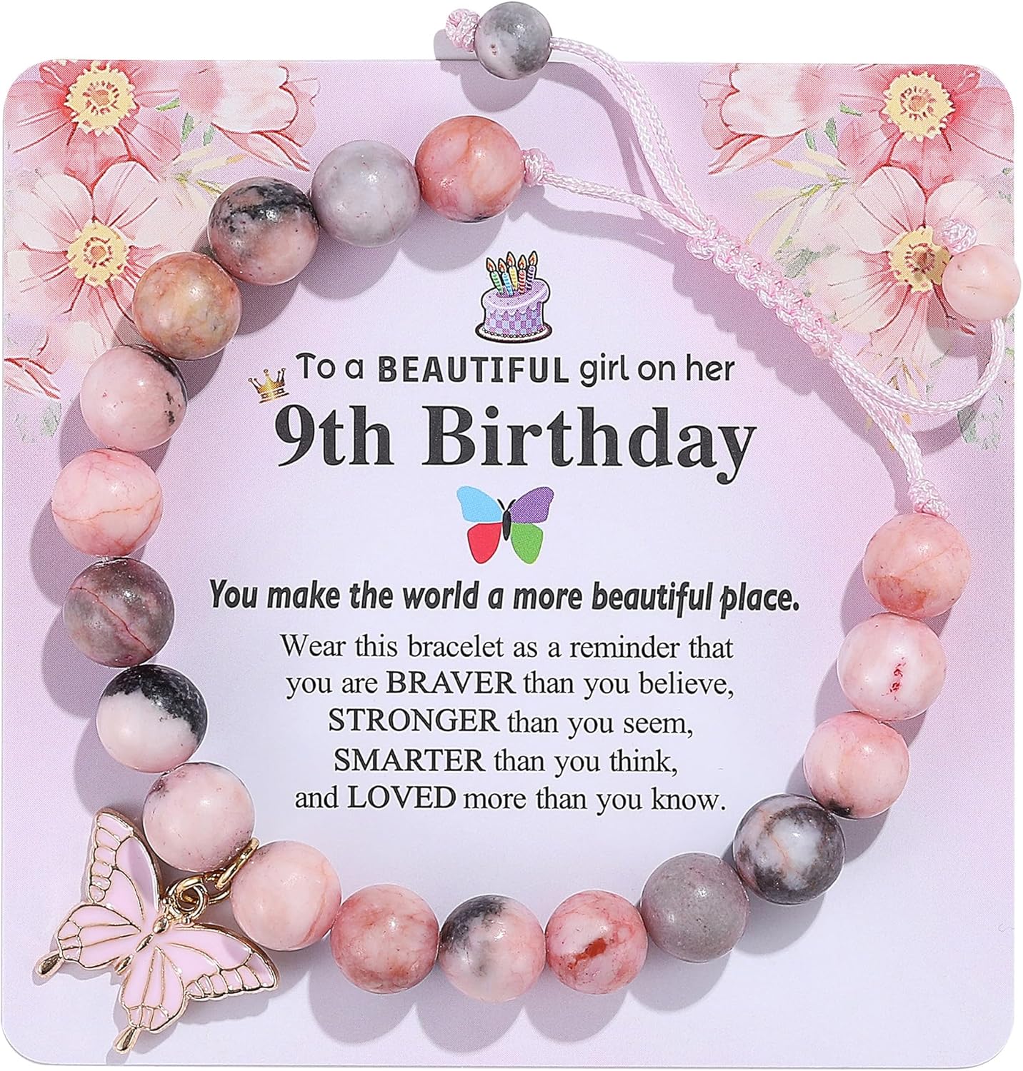 Birthday Bracelet Gift for Girls 6-13 Years Old, Pink Zebra Natural Stone Butterfly Charm Bracelet for Daughter Granddaughter Niece Teenage Girl Birthday Gift