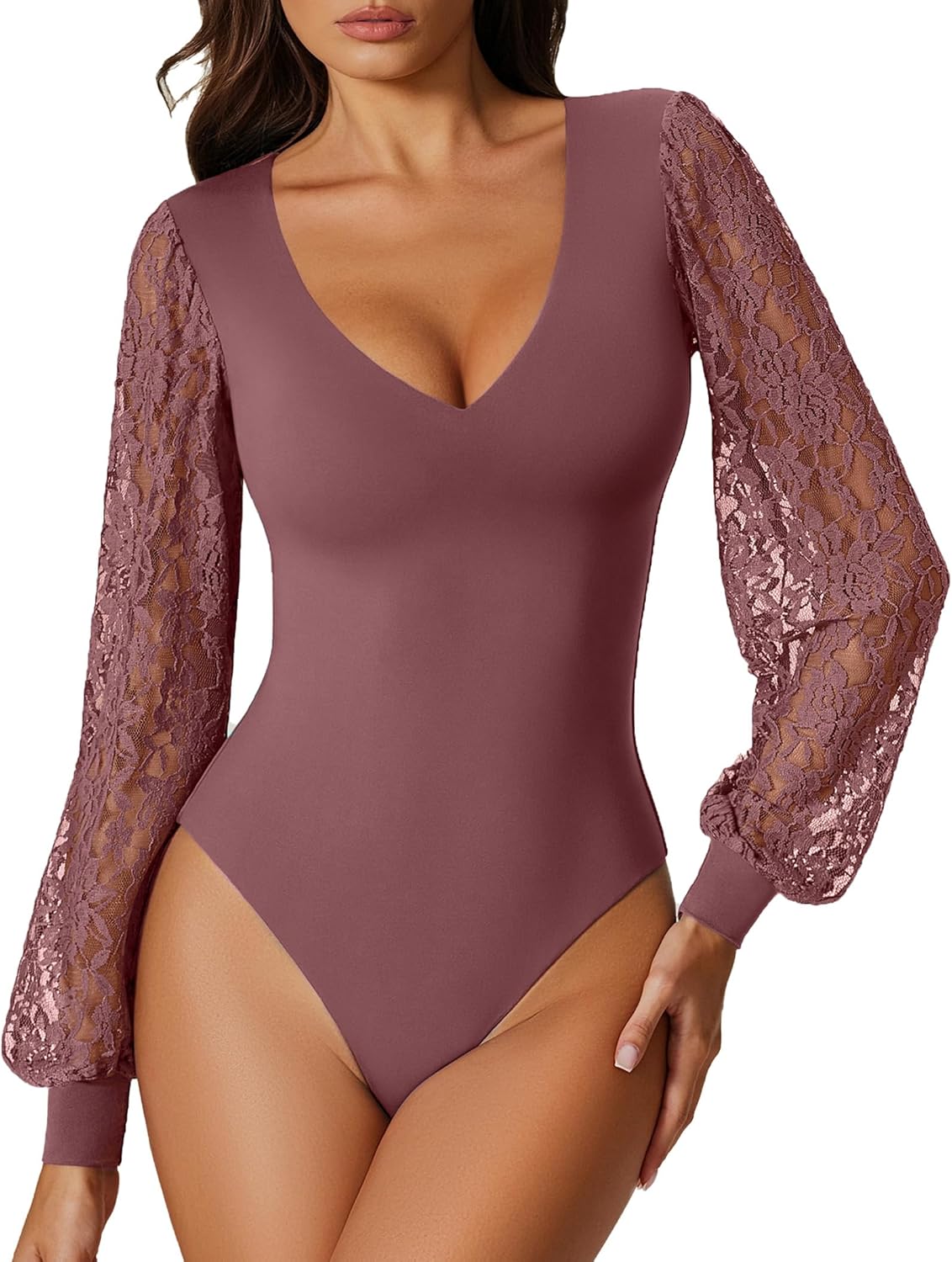 Avidlove Womens Long Sleeve Bodysuit Double Lined V Neck Lace Puff Sleeves Going Out Top Shirts Thong Leotard Body Suit