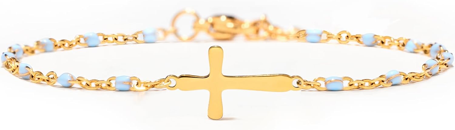 STORYJEWELLERY Cross Bracelet for Women, Gold Plated Charm Bracelets, Blue Beaded Chain Faith Bracelet, Christian Jewelry for Women, Religious Gifts, Confirmation and Bapstism Gifts