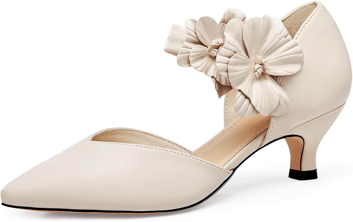 Coutgo Womens Low Kitten Heels Dressy Shoes Comfortable Closed Toe Flower Slip on Formal Party Dance Heeled Pumps