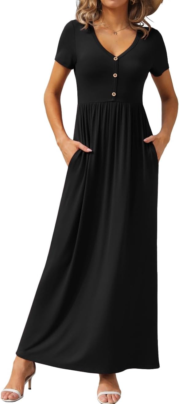 GRECERELLE Womens Summer Long Maxi Dresses 2026 Short Sleeve V Neck Casual Button Dress with Pockets
