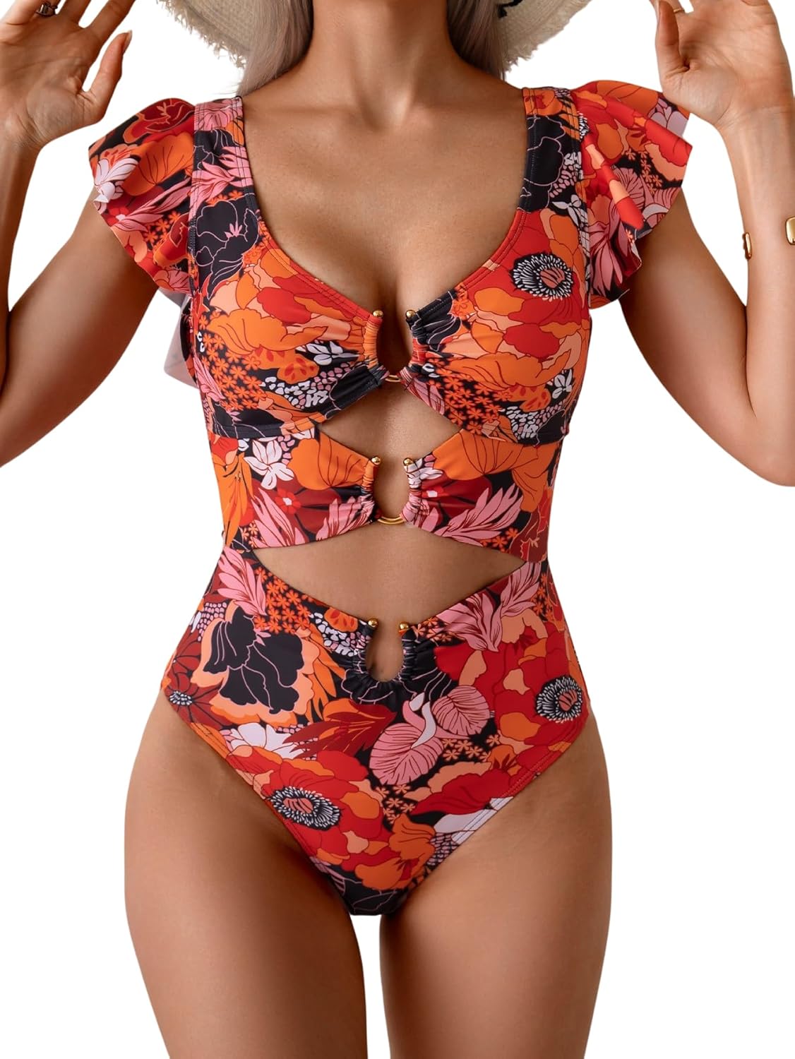 B2prity Women One Piece Swimsuit Ruffle Sleeve V Neck Monokini Cutout Tummy Control Bathing Suit for Vacation