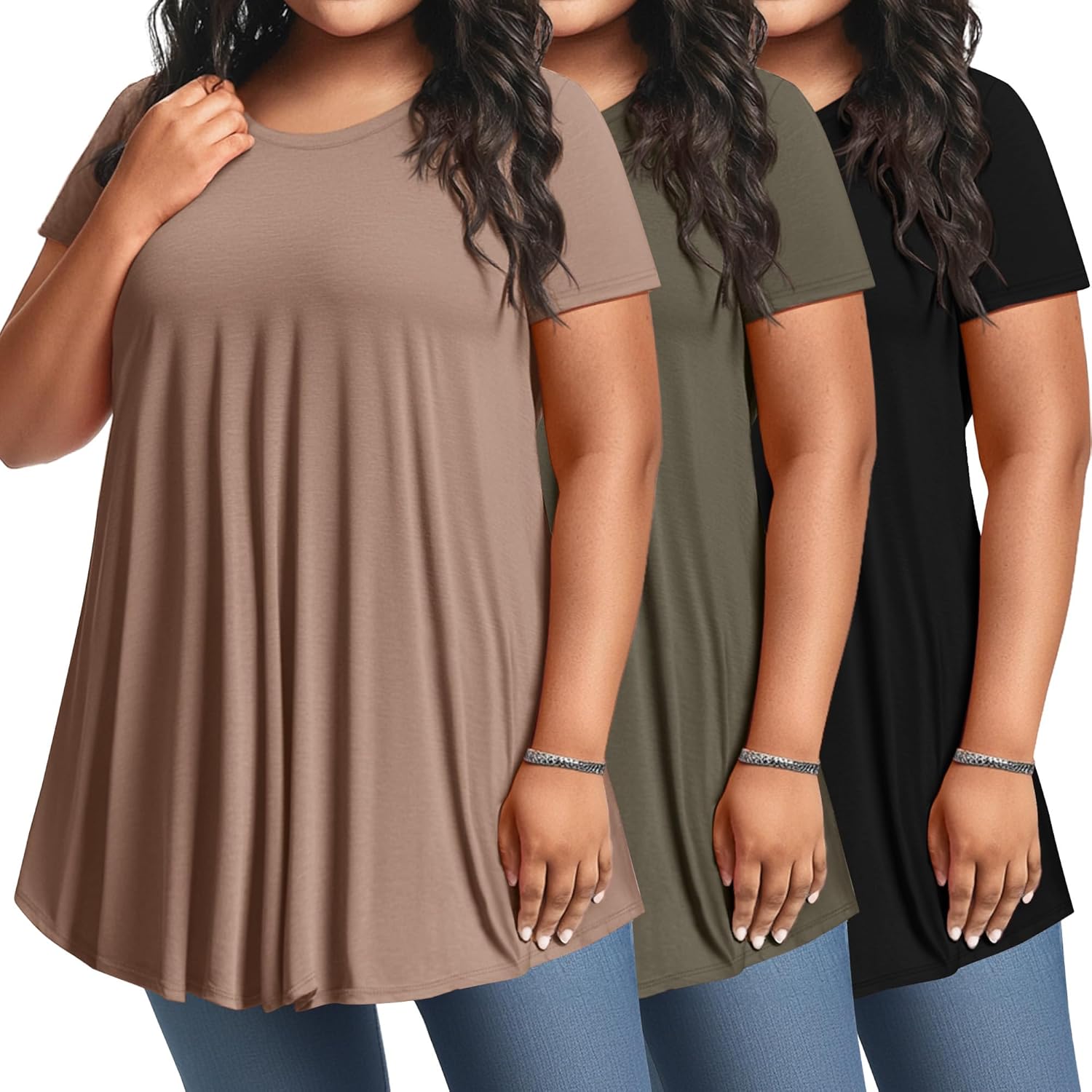3 Pack Women's Plus Size Tunic Top Short Sleeve Long Shirts Summer Loose Fit Flowy Blouse Wear with Leggings