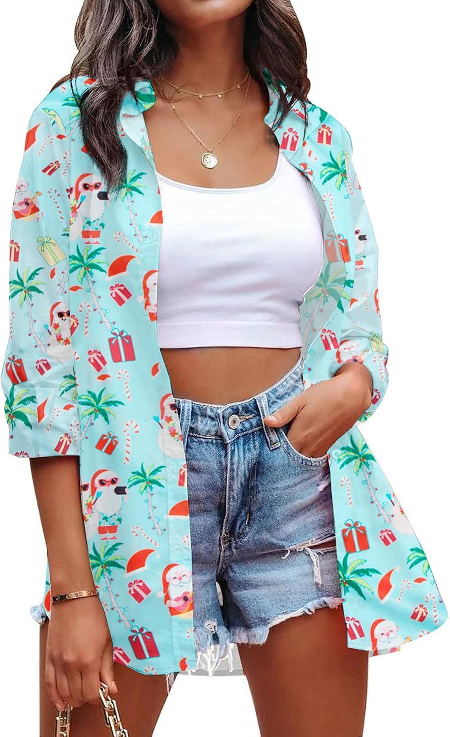 Christmas Button Down Shirts for Women Hawaiian Holiday Long Sleeve Tops
