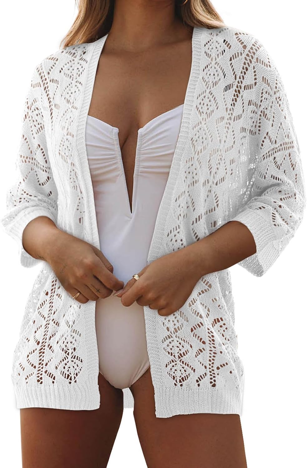 SHEWIN Women Summer 3/4 Sleeve Crochet Coverup Open Front Beach Cover Ups 2026