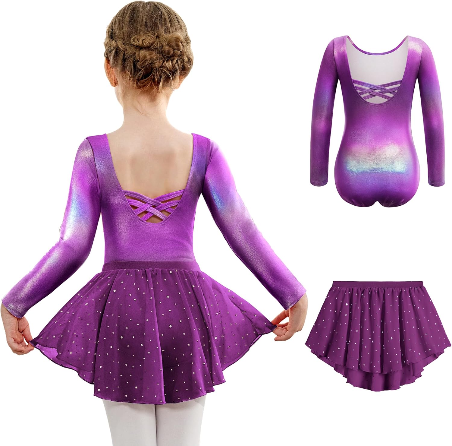 Arshiner Girls Ballet Leotards with Chiffon Dance Skirt Long Sleeve Crisscross Back Toddler Dance Outfit Combo