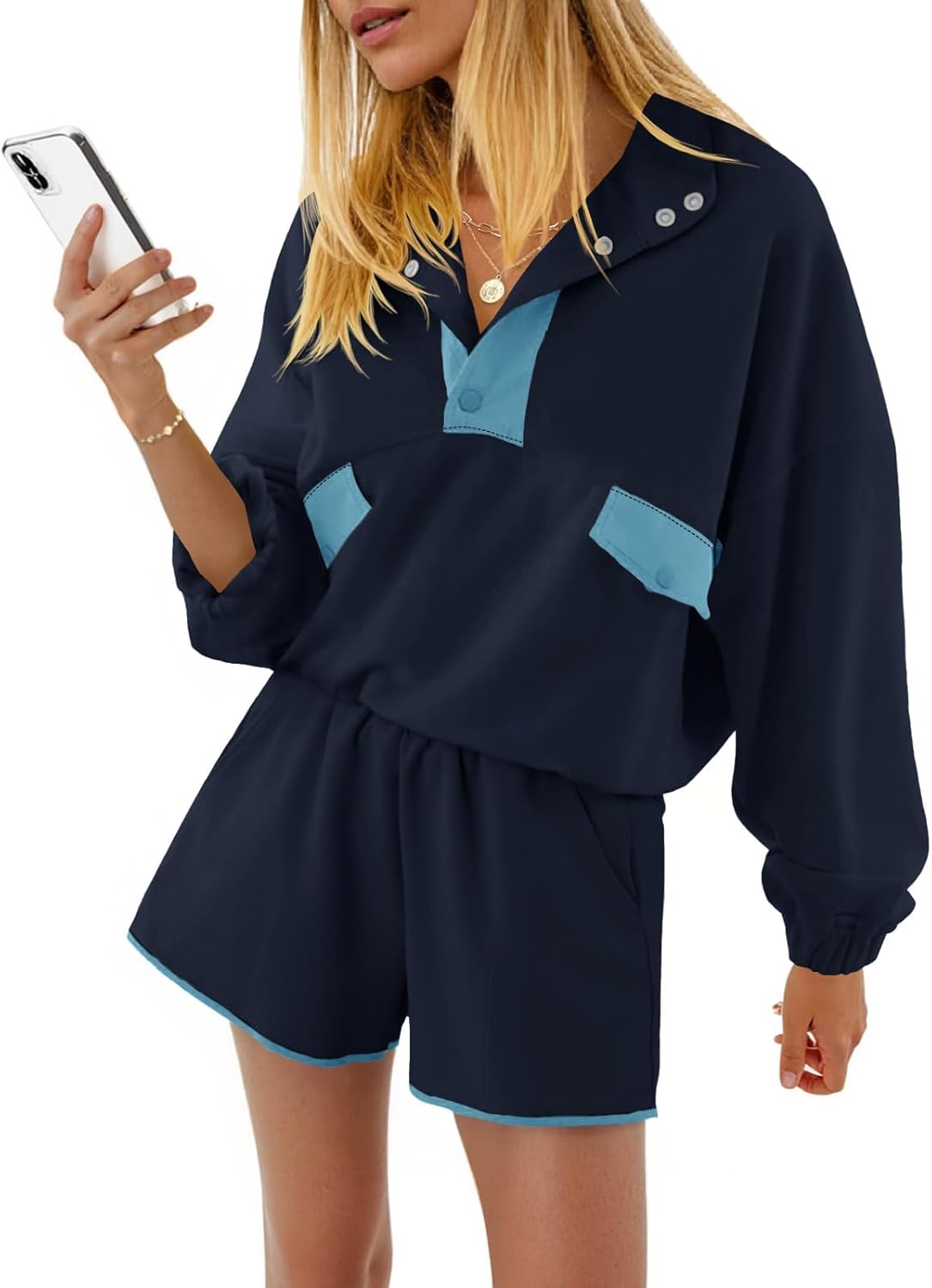 Fisoew Womens 2 Piece Sets Sweatsuits Casual Half Button Color Block Sweatshirts Running Shorts Tracksuits Fall Outfits