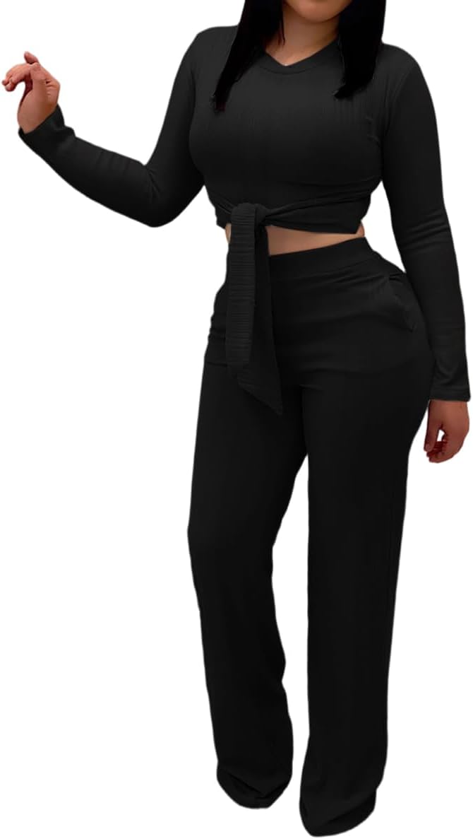 Two Piece Sets For Women Sexy Tie Front Long Sleeve Crop Top Wide Leg Pants Set Casual Tracksuit Ribbed 2 Piece Outfits