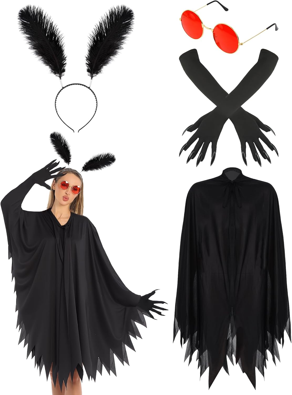 Halloween Unisex Mothman Costume Paw Gloves Glasses Headband Black Cape for Adult Halloween Cosplay Party(Elegant)