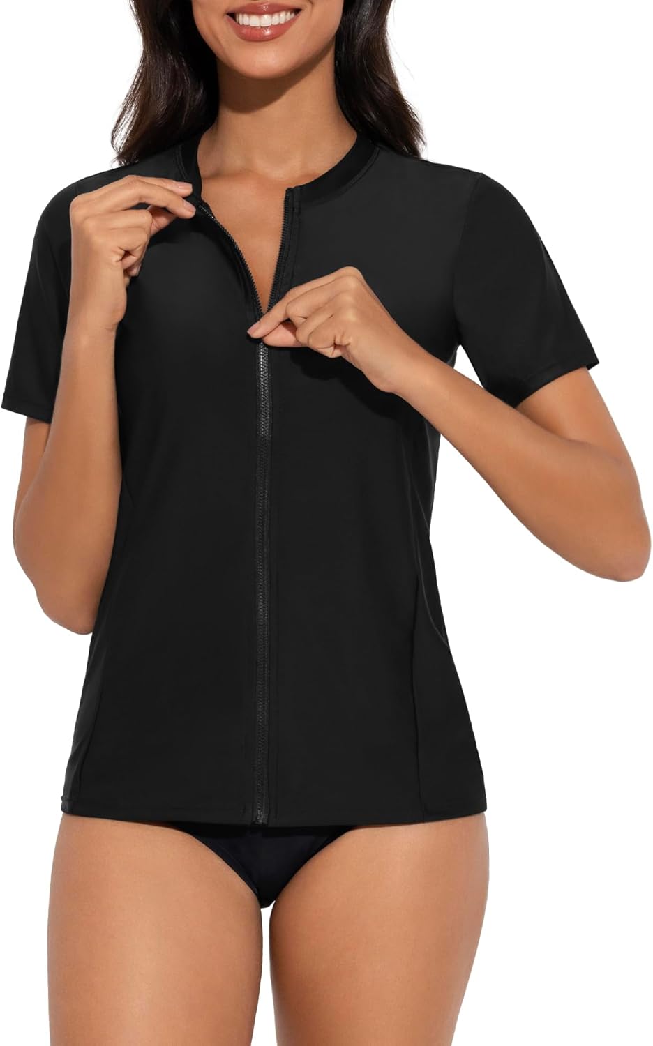 Bonneuitbebe Women's Rash Guard Short Sleeve Swim Shirts Zip Front Rashguard Swimsuit UPF 50+ Swim Tops No Bra & Pocket
