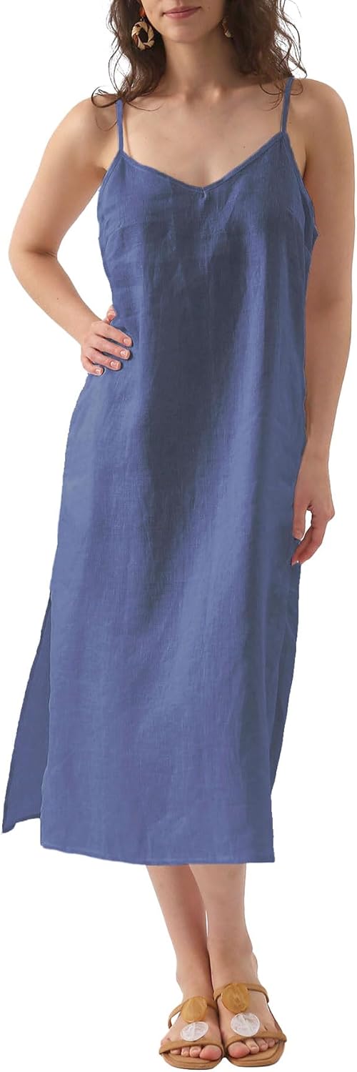 Amazhiyu Womens Pure Linen Summer V Neck Midi Spaghetti Strap Slip Dress with Pockets