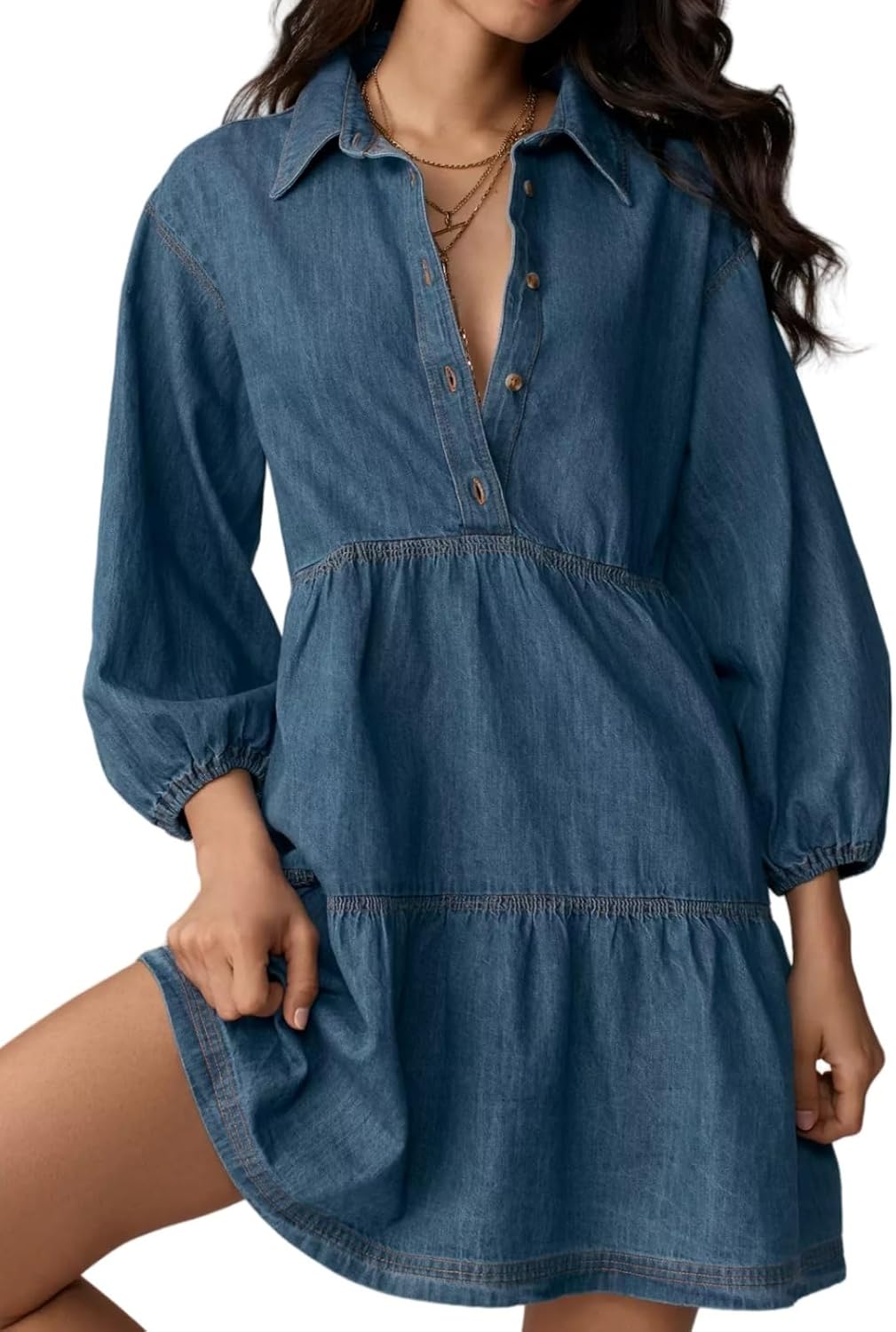 Women Denim Mini Dress 2026 Summer Casual 3/4 Puff Sleeve Button Down Collared Babydoll Loose Jean Shirt Dresses