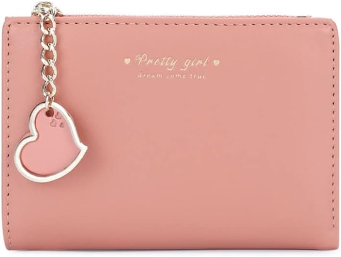 Small Wallet with Heart Pendant Bifold Wallet Zipper Pocket Cash Card Holder Coin Purse for Women Girls (PINK)