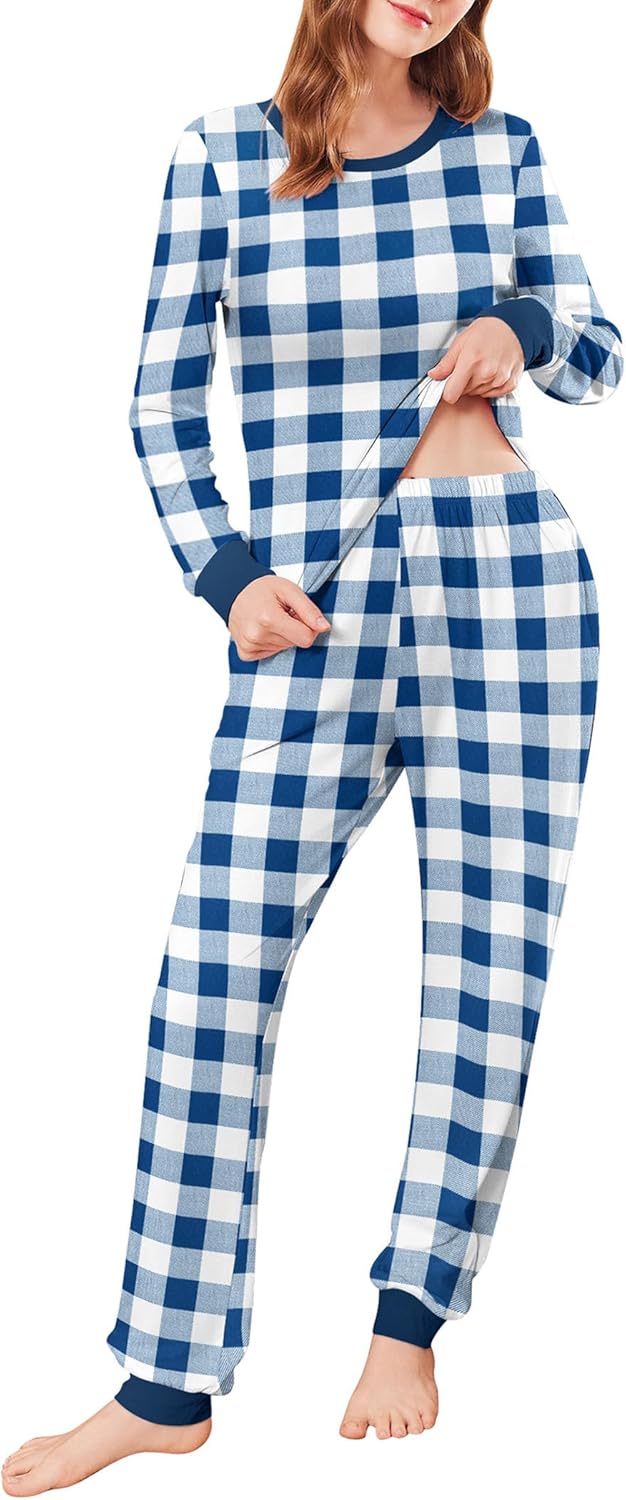 Vlazom Women's Pajama Set 2 Pieces Soft Sleepwear Set Warm Long Sleeve Sweatshirt and Long Plaid Pants with Pockets S-XXL