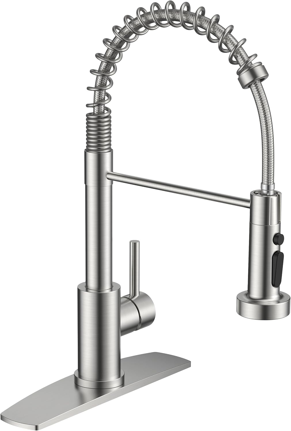 FORIOUS Kitchen Faucets with Sprayer, Brushed Nickel Stainless Steel Sink Faucet Single Handle with Deck Plate, Commercial Classic Spring Faucet for Kitchen Sink, Farmhouse, Laundry Bar RV Camper