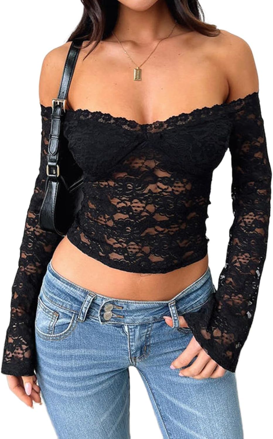LOFAAC Women Off Shoulder Floral Lace Going Out Crop Tops Sexy Slim Long Sleeve See Through Backless Crop Blouse Shirts