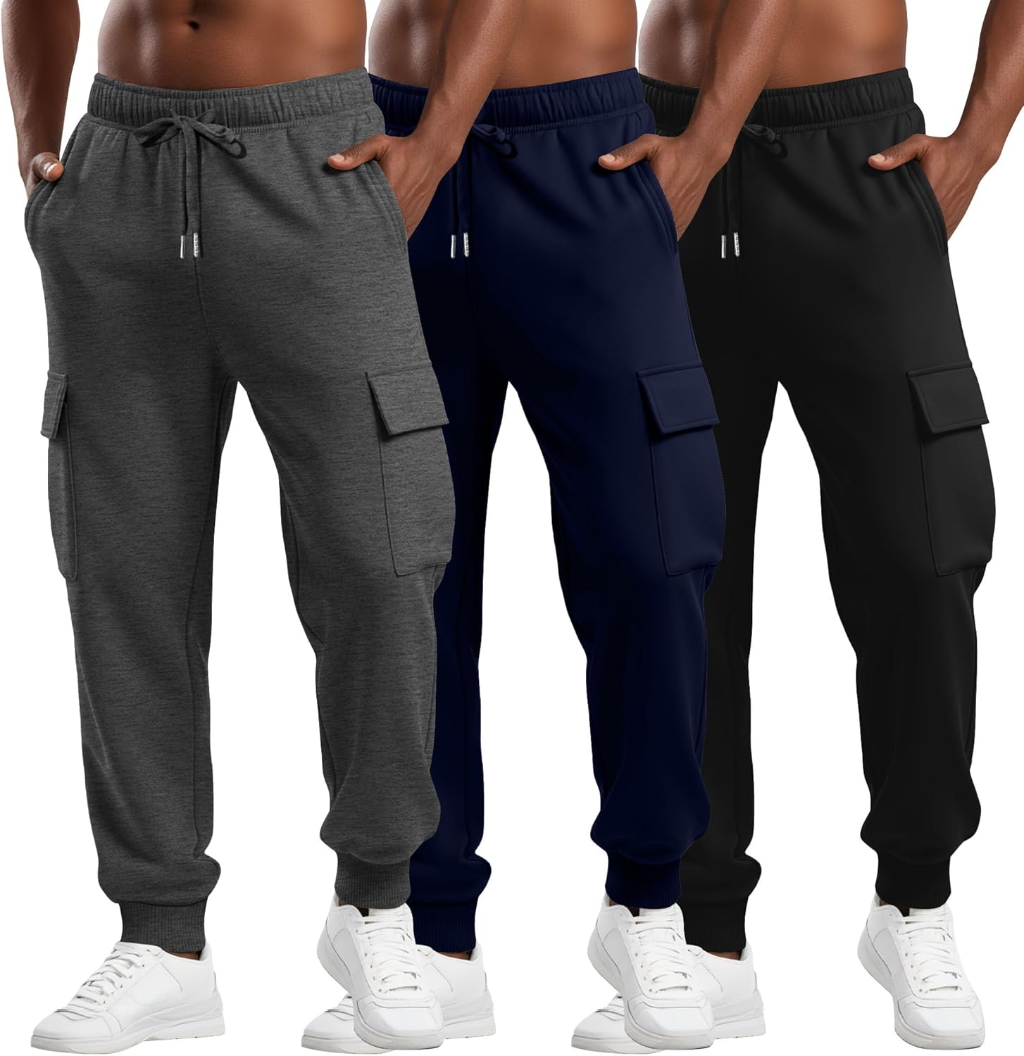 August Alley 3 Pack Men's Cargo Sweatpants Relaxed Fit Drawstring Elastic Waist Joggers Active Tapered Pants with Pockets