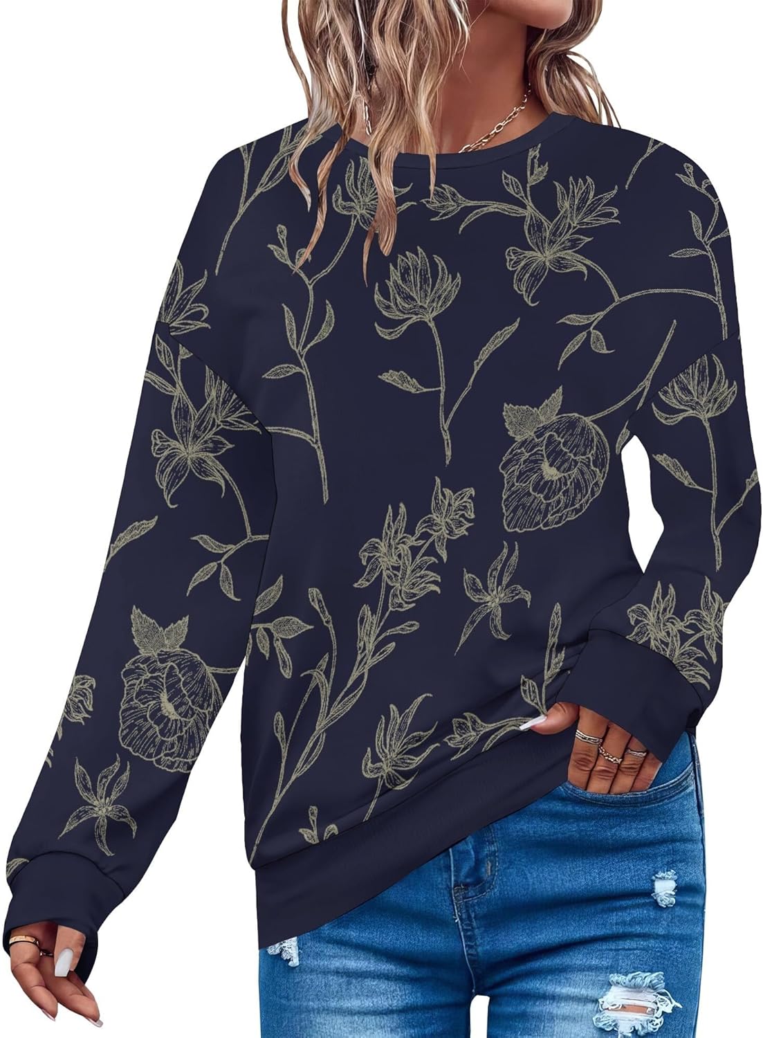 Sweatshirts For Women Retro Floral Long Sleeve Crewneck Sweatshirts Cute Comfy Fit Pullover Vintage Street Wear