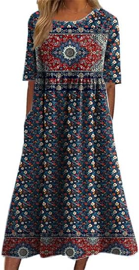 Boho Dress for Women Floral Print Short Sleeve Crewneck Plus Size High Waist Smocked Flowy Swing Ruffle Dress