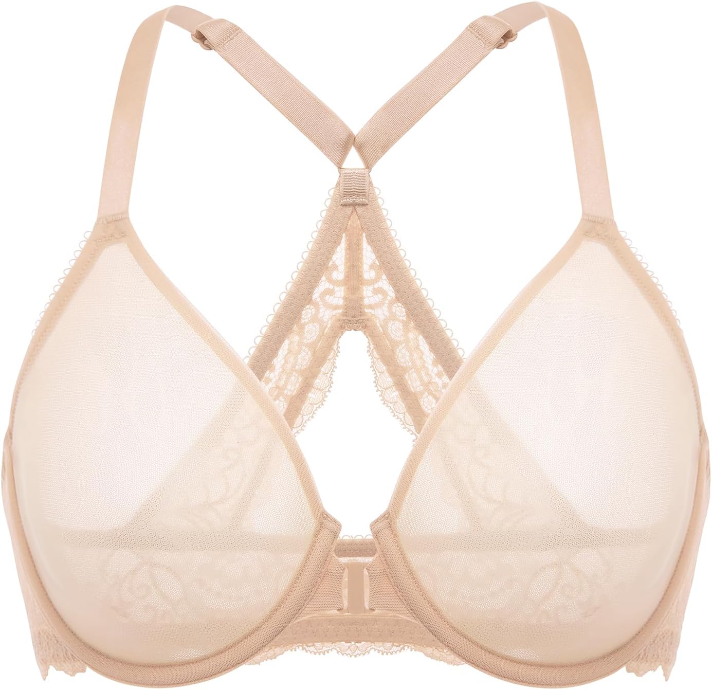 DELIMIRA Women's Front Closure Bras Racerback Sheer See Through Full Coverage Plus Size Underwire Unlined Bra